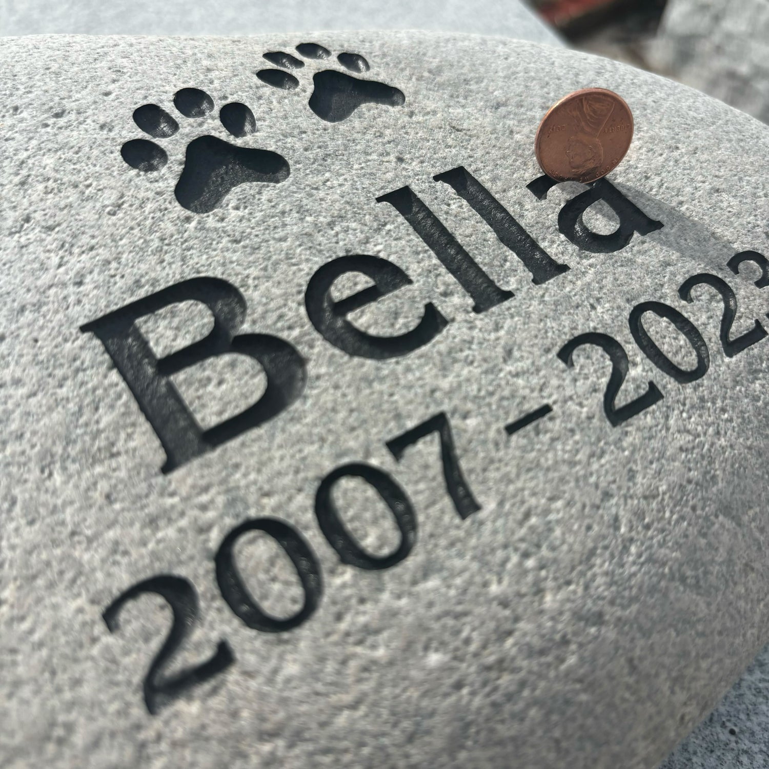 Real pet stones are all natural river rocks, sourced from America. Real rocks can't be laser etched. Instead, each rock is designed and sandblasted by a Realpetstone.com craftsperson.