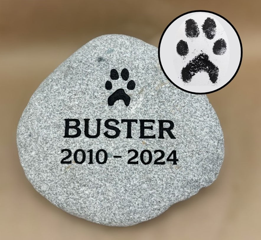 Engrave an outline of your pets actual paw on an all natural river rock!